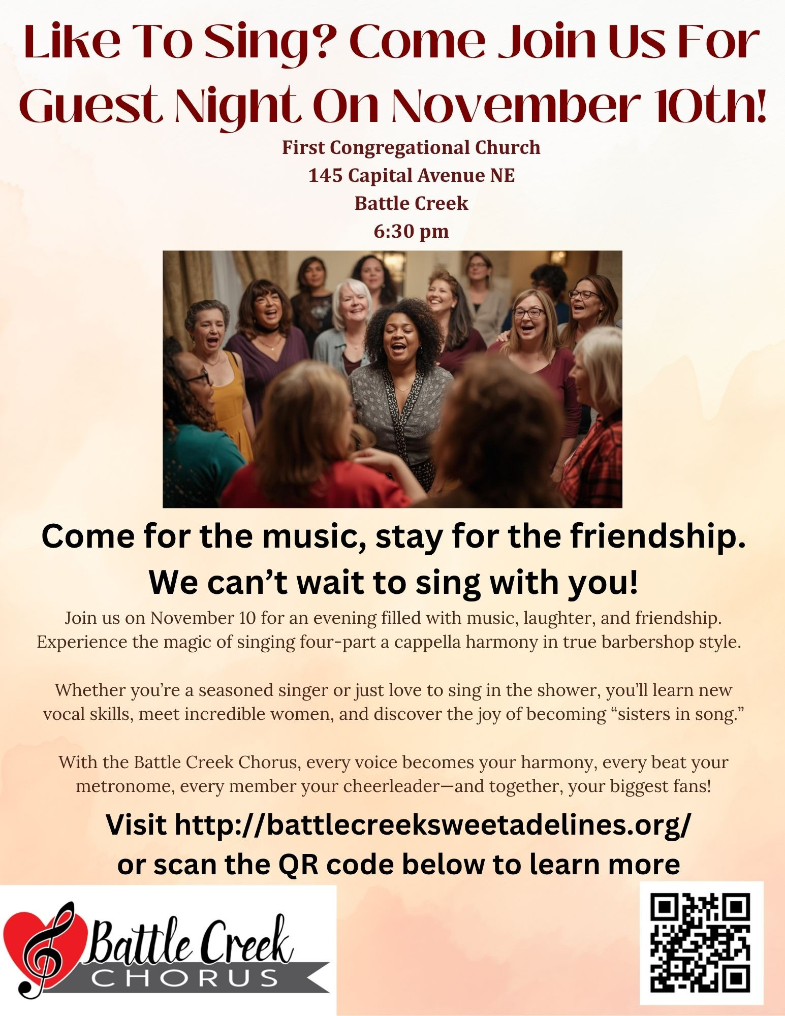 We are celebrating over 66 years of Harmony in 2025. The Battle Creek Chorus practices 4- part, a cappella harmony regularly on Monday and encourages guests to attend a rehearsal who would like to learn or understand a unique form of singing. No experience necessary ... if you don't read music, that's fine. We have learning tracks and members to help you! You must be able to match pitch. For more information regarding our upcoming performances or to visit the Chorus as a guest, please contact Membership Coordinator, Dawn Wendzel - 1 (269) 352-6717  OR Judy Burgess - Team Coordinator -  [email protected], (248) 830-9534.